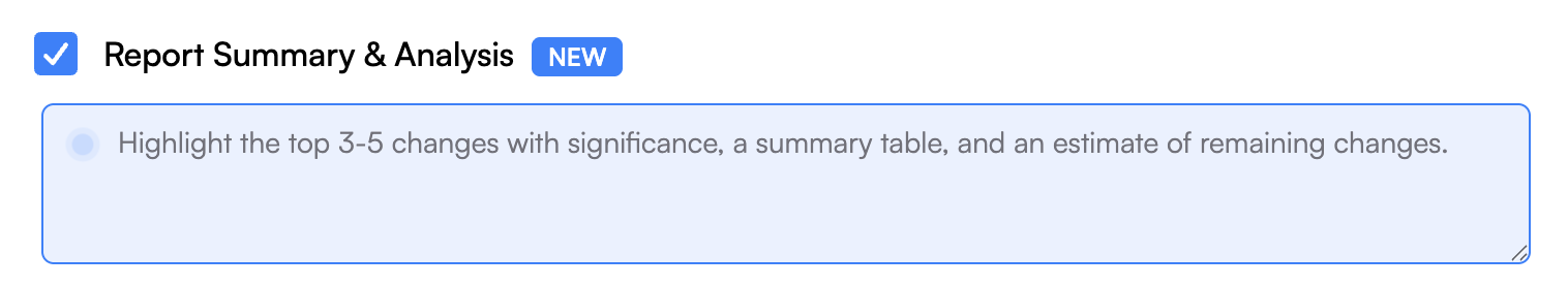 Reports give you a bird's-eye view of all detected changes over a period of time — but when you're tracking dozens of pages, reading through every entry can be overwhelming. Enable Report Summary & Analysis and our AI will produce a written summary tailored to your needs based on your prompt, so you and your team can understand what happened at a glance.