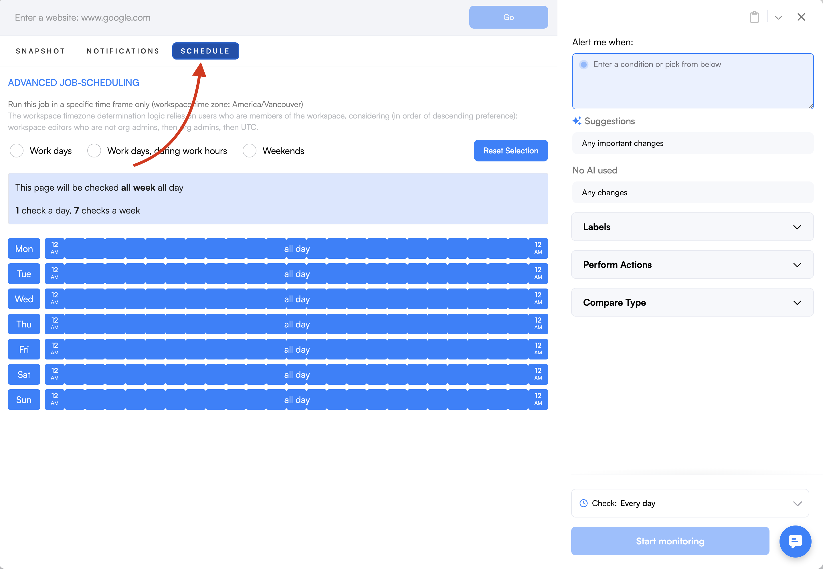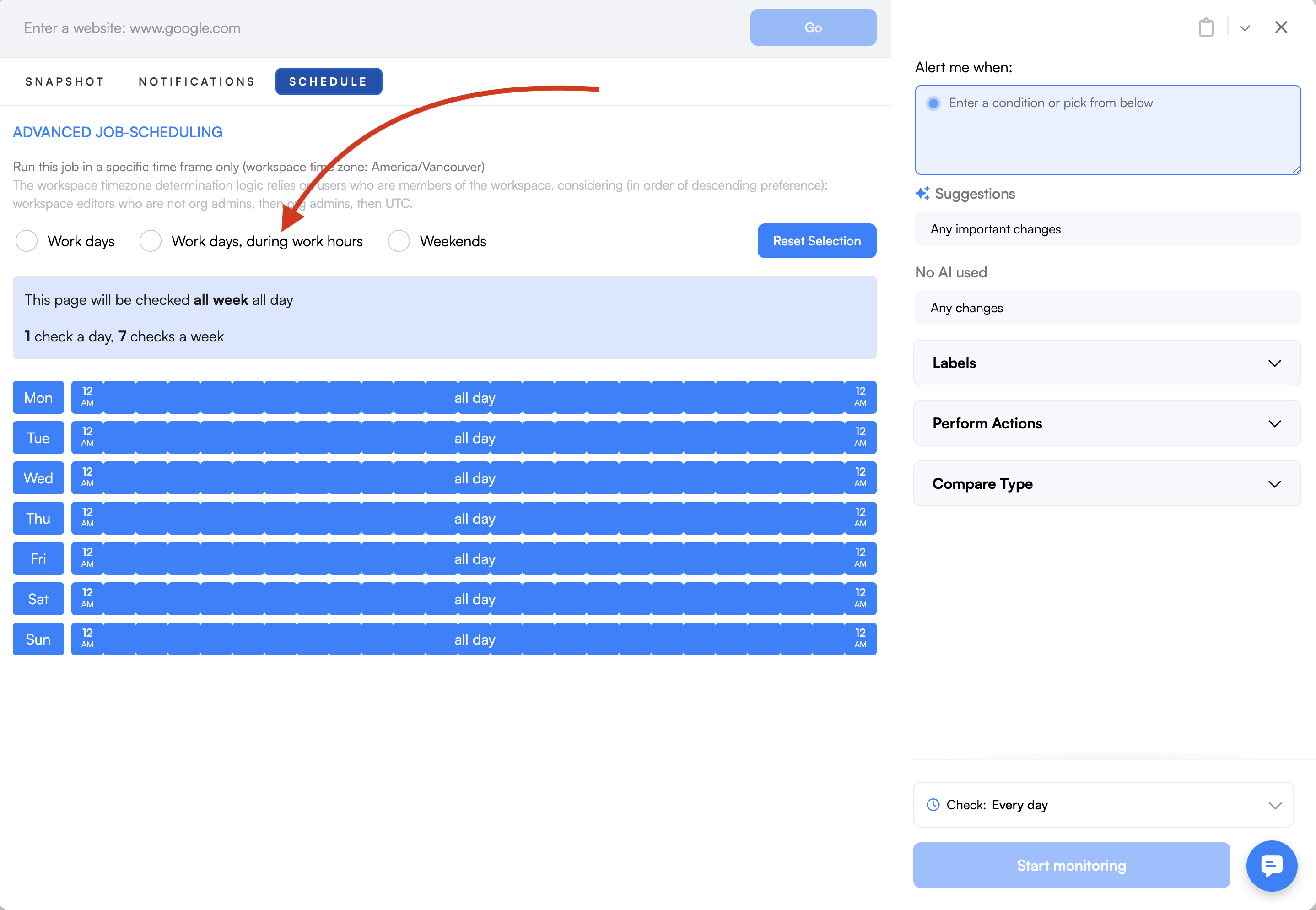 Visualping’s Advanced Scheduling tool allows you to automatically run jobs within a specific timeframe. By using this feature, you can prevent notifications when inconvenient or outside of your working day.