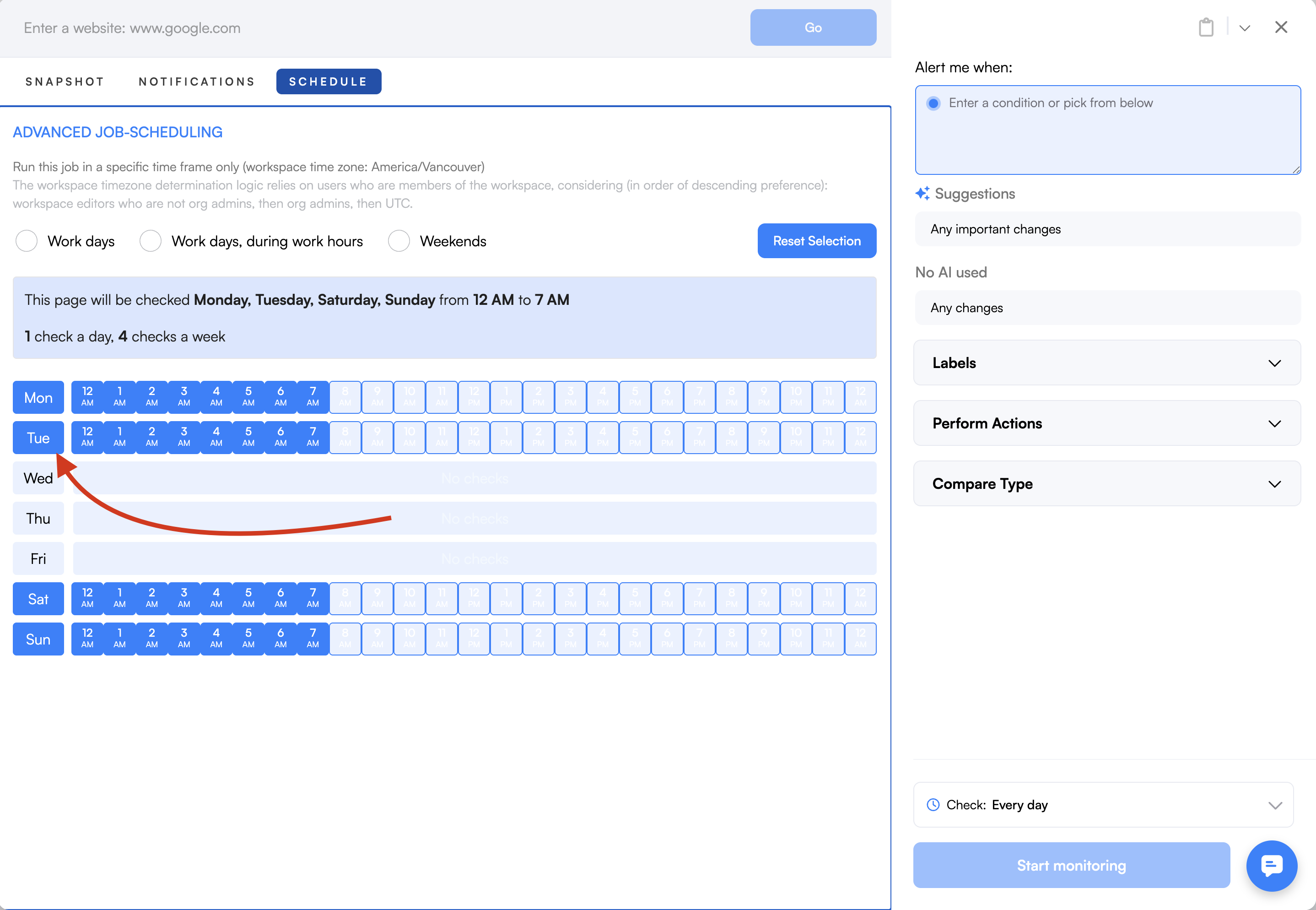 Tip: If you need to check a site at multiple specific times, we recommend setting a higher check frequency (such as every 6 hours) and extending the schedule block to cover your desired window (e.g., 9am–5pm), which would allow multiple checks per day, but (i.e., at 9am, six hours later at 3pm, and no more until the next day).