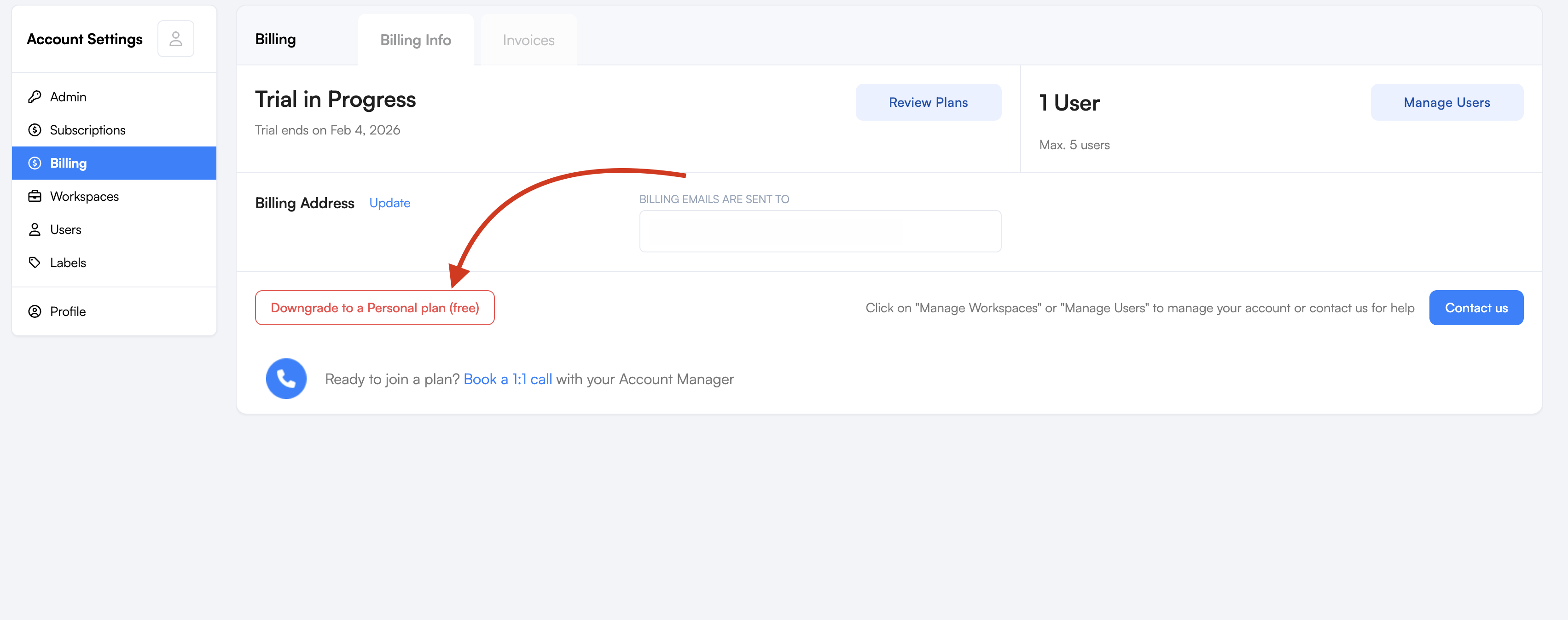 To deactivate an account on a Business trial, go to your dashboard and click on Settings > Billing > Downgrade to a Personal plan (free). From there, you can either downgrade to a free plan then follow the steps to deactivate a personal account, or directly deactivate your account.