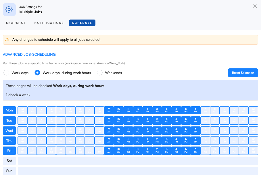 Job Settings: Bulk applies settings, such as frequency, thresholds, actions, adjustments, and schedule.
