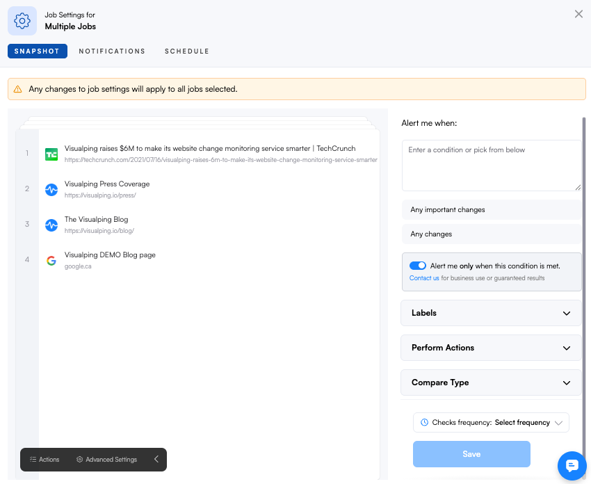You can edit the AI important definition, Labels, Actions, Advanced Settings, Compare Type, and Frequency you want to apply to all selected jobs.